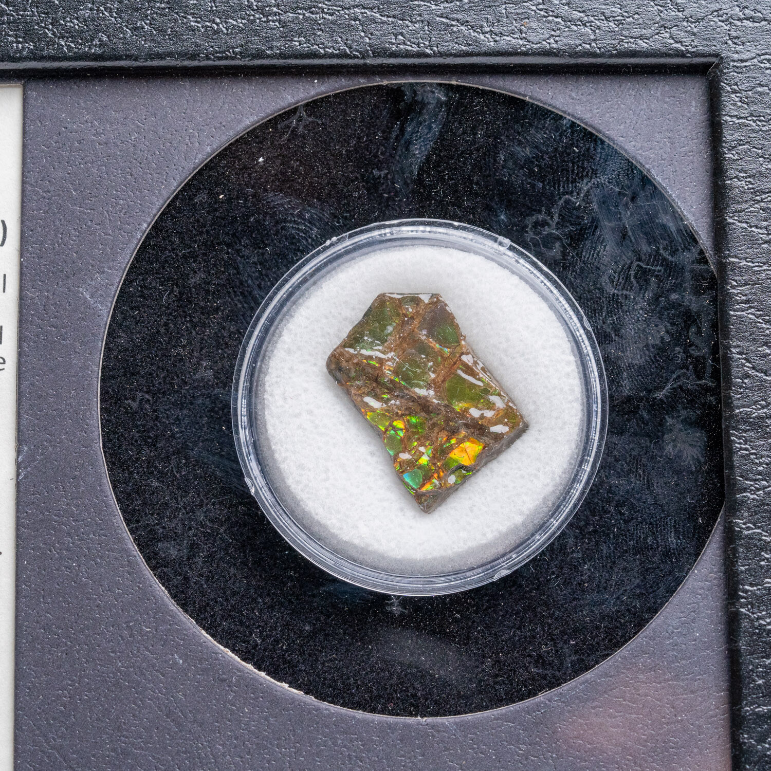 Experience the beauty and wonder of fossilized history with a Genuine Ammolite Fossil. This stunning stone is formed from a mineralized ammonite, resulting in a unique iridescent pattern that changes with lighting and viewing angle. Each specimen is carefully presented in a custom glass-topped case for effortless display.