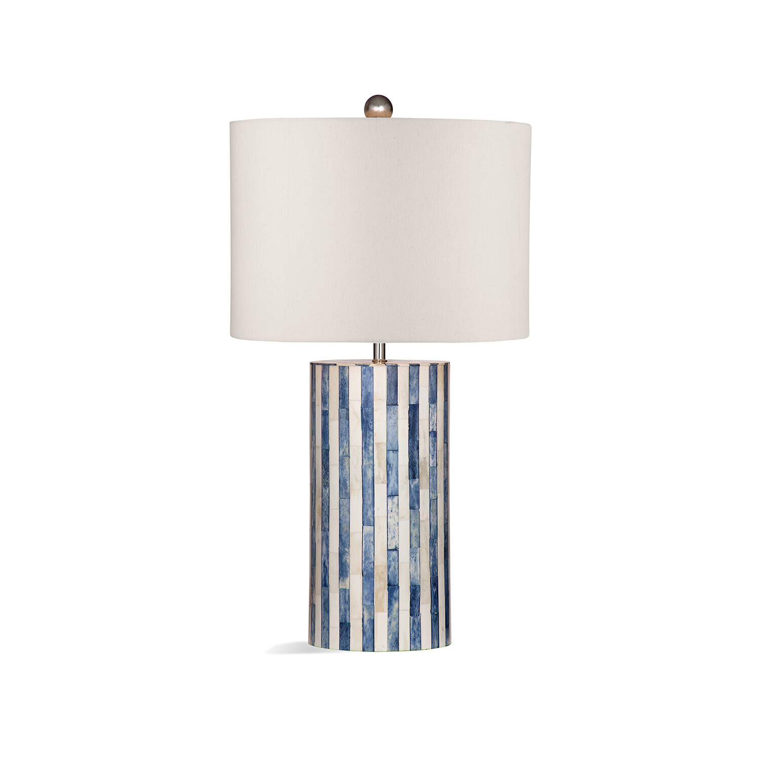 The Coburn Table Lamp features a round base crafted of blue and white bone inlay. The handcrafted details are produced by a skilled artist, making each lamp completely unique. The white linen drum shade is held up with a silver fixture that adds modern style.