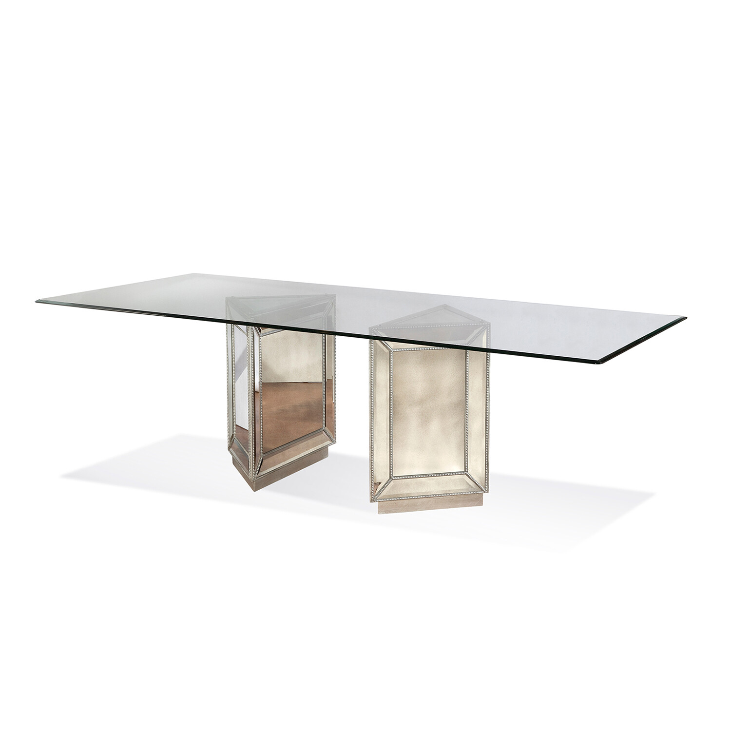 The Murano Dining Table brings modern elegance to your dining room. Featuring triangular pedestal bases with antiqued picture-frame edged mirror panels and a 100% silver leaf beaded detail that adds modern elegance to an Old World charm.