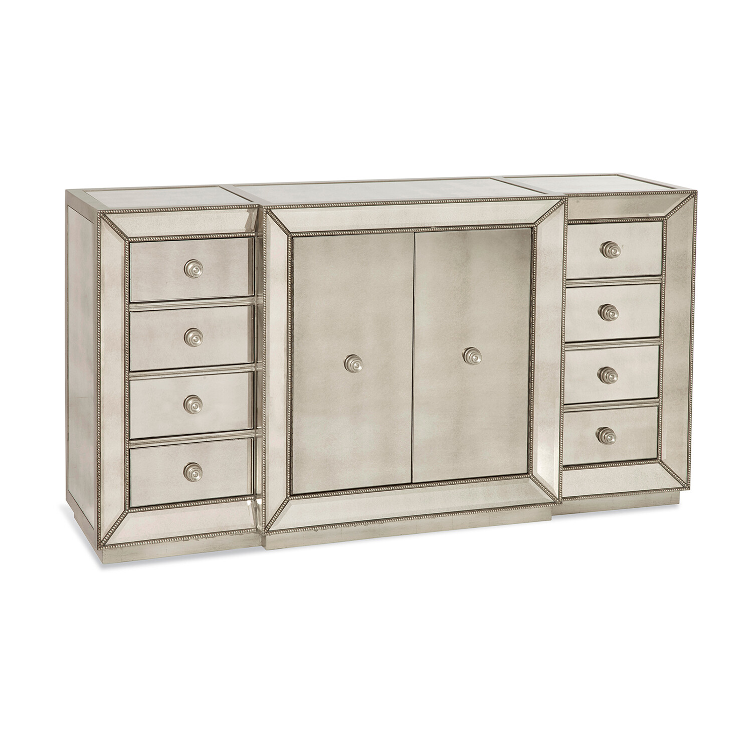 The Murano Server is modern elegance and old world charm to your dining room or bar. Featuring antiqued picture-frame edged mirror panels and a silver leaf beaded detail, the Murano Server includes a two door cabinet and 8 storage drawers.
