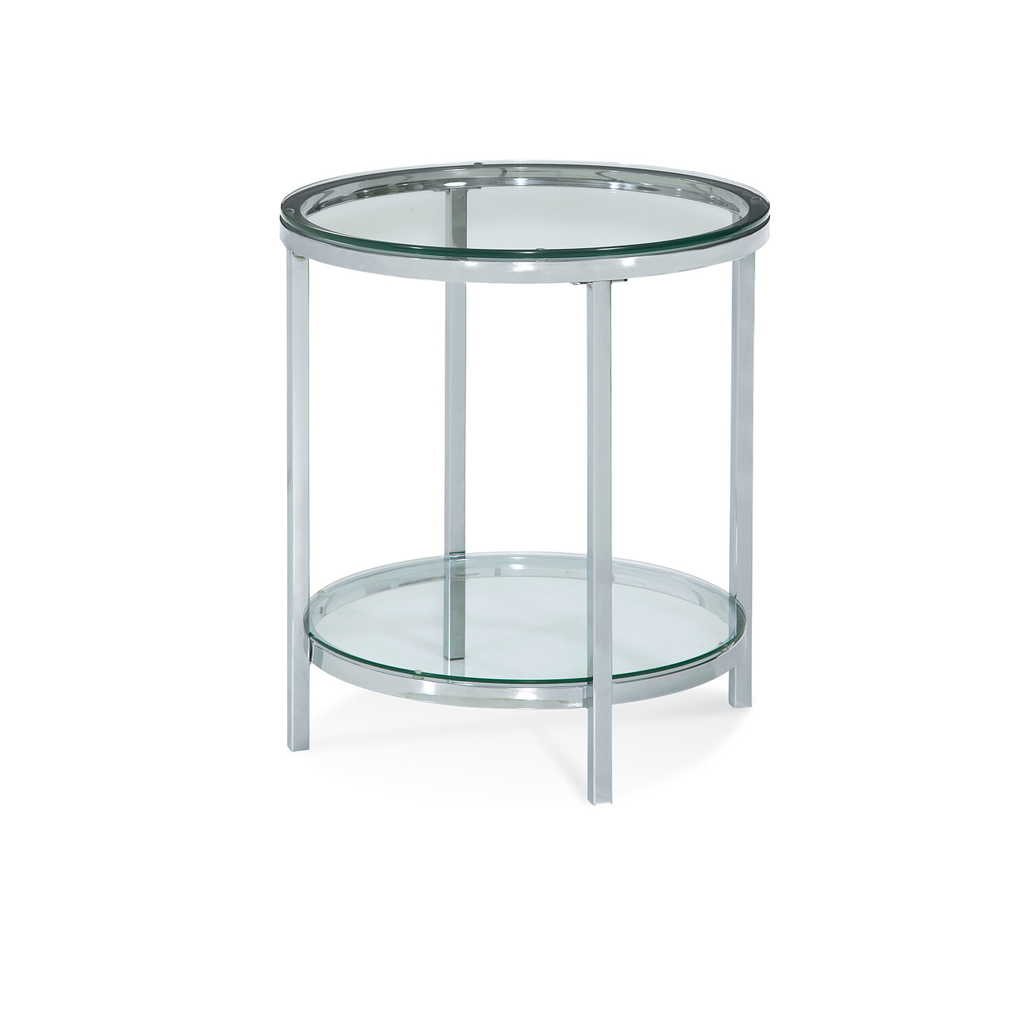 The sleek and modern Patinoire End Table brightens any setting with chrome plate finishing, polished bull-nose glass top and a glass lower shelf for displaying your decor.