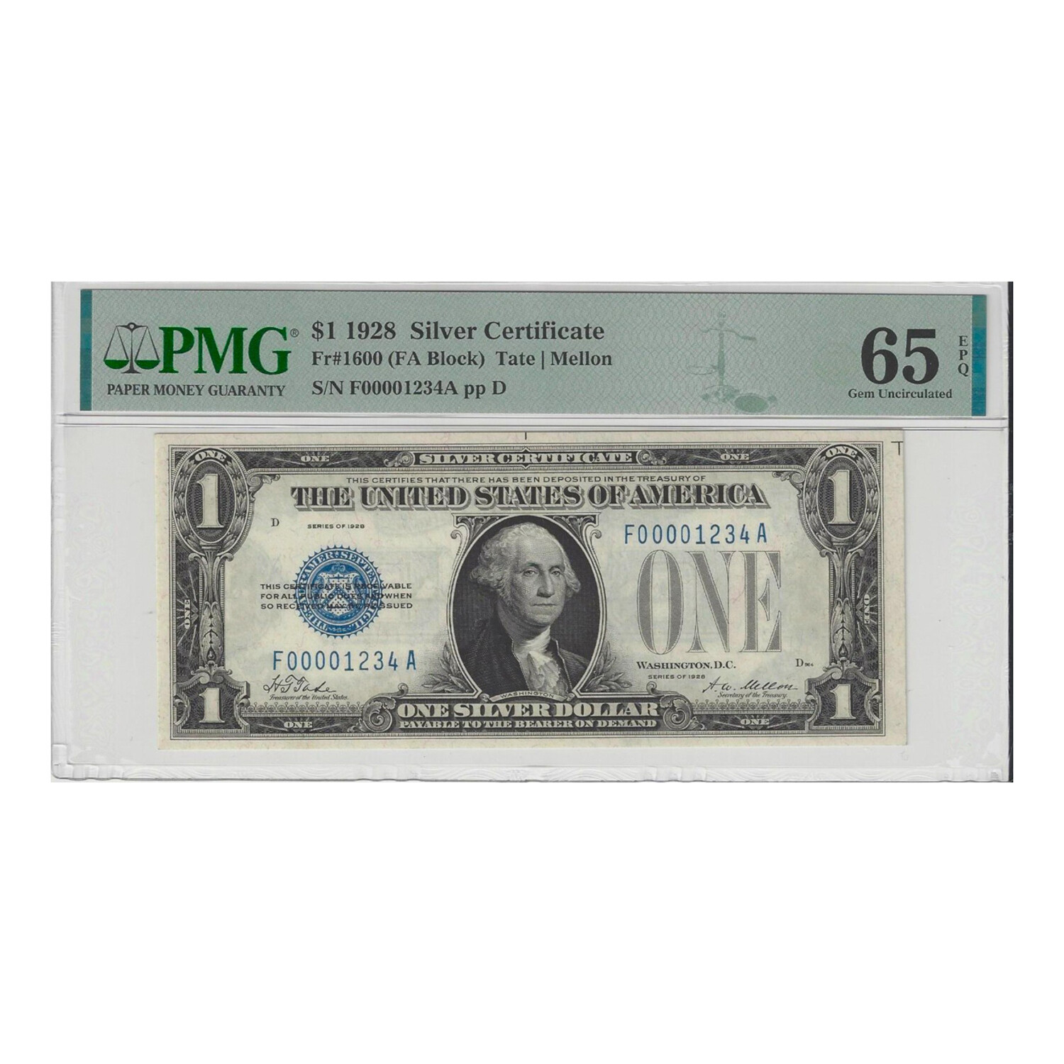 Being offered today is an EXTREMLY RARE, AND I DO MEAN RARE, LOW SERIAL NUMBERED - HIGH GRADE 1928 $ 1 Silver Certificate note. The note is graded by PMG in 65 Gem Uncirculated (GEMCU) Exceptional Paper Quality (EPQ).