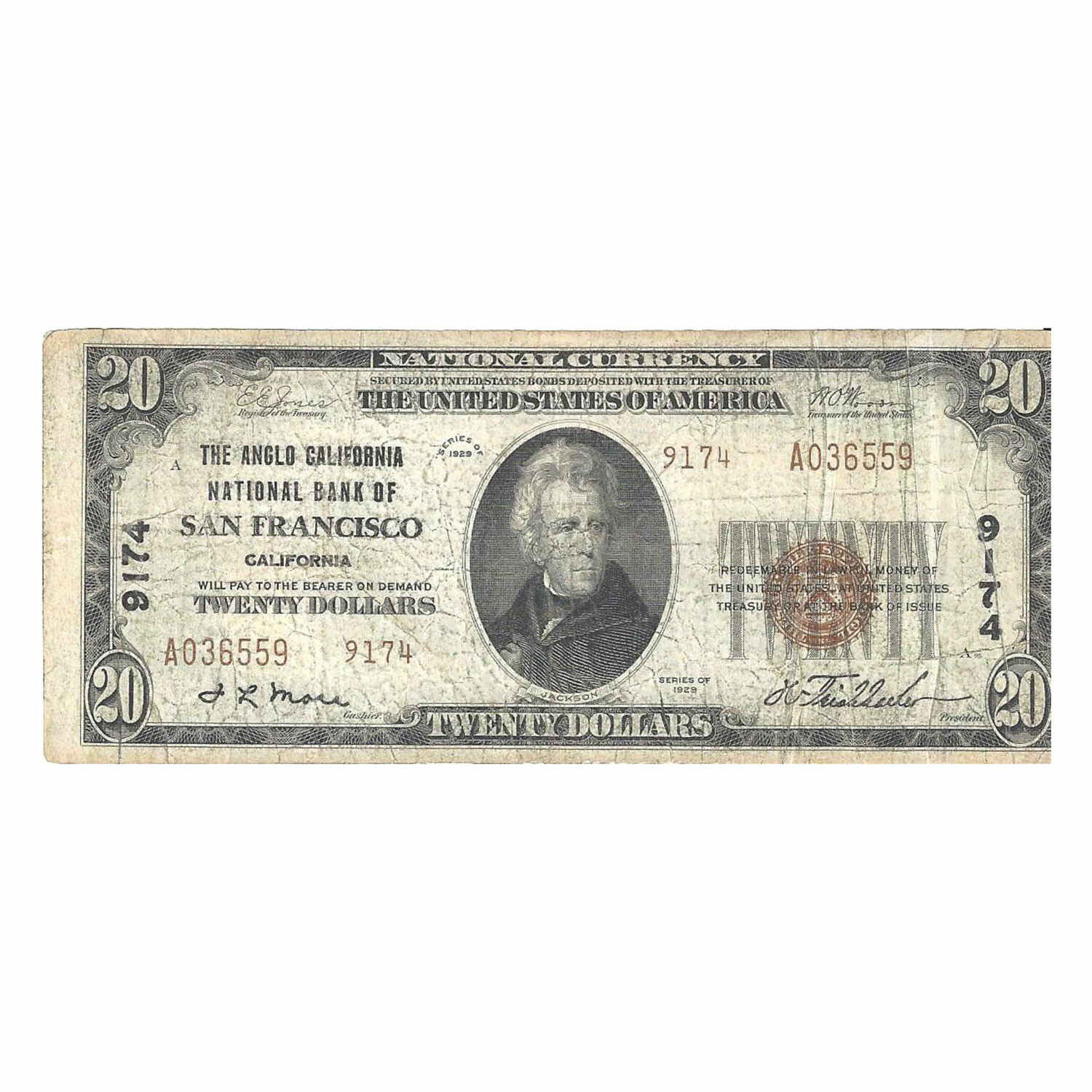This note is a 1929 $ 20 ANGLO CALIFORNIA NATIONAL BANK OF SAN FRANCISCO, CALIFORNIA. Their charter number was 9174. It has a low serial # A036559. This note is the RARER Type 2.