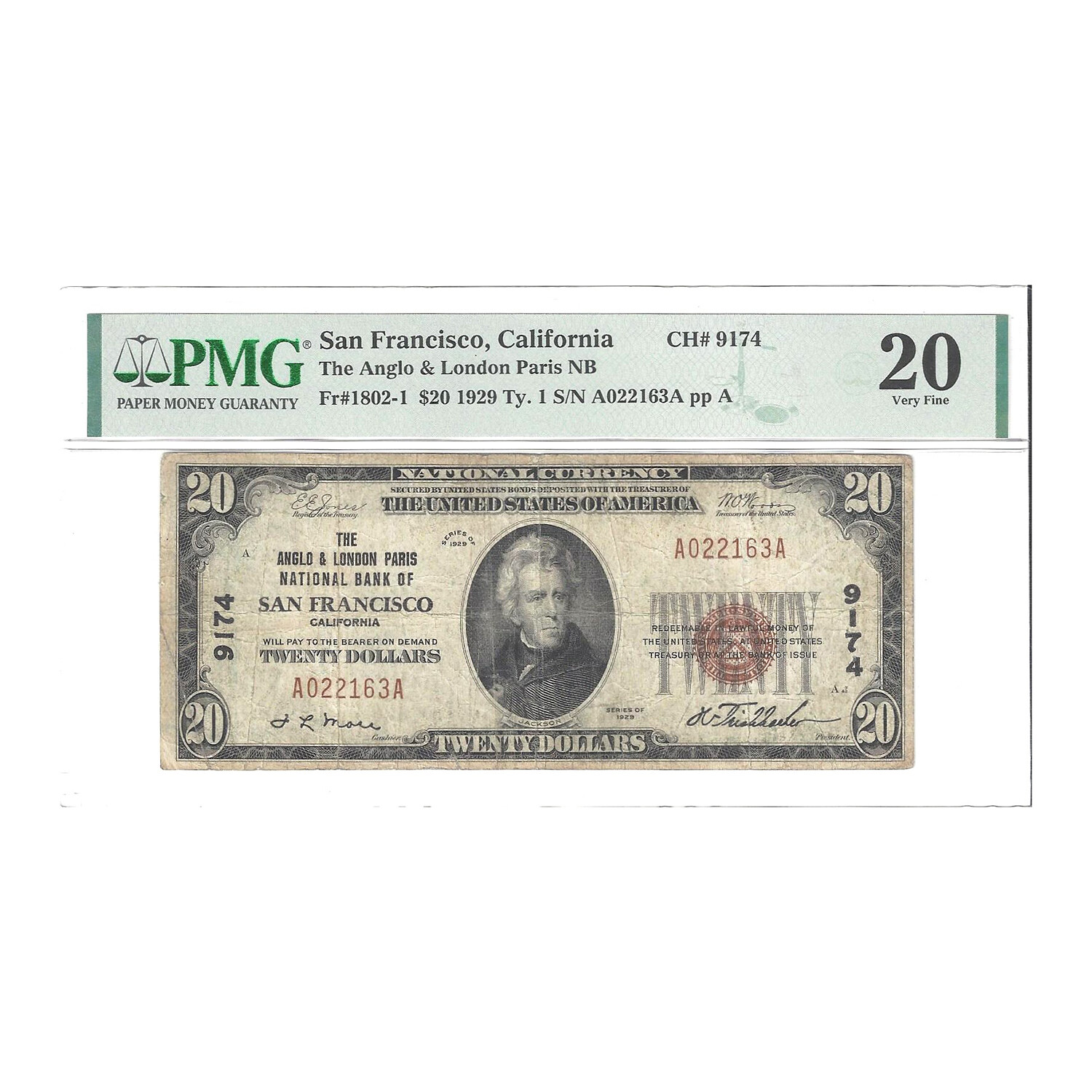 1929 $ 20 ANGLO & LONDON PARIS NATIONAL BANK OF SAN FRANCISSCO CALIFORNIA PMG 20 # 163