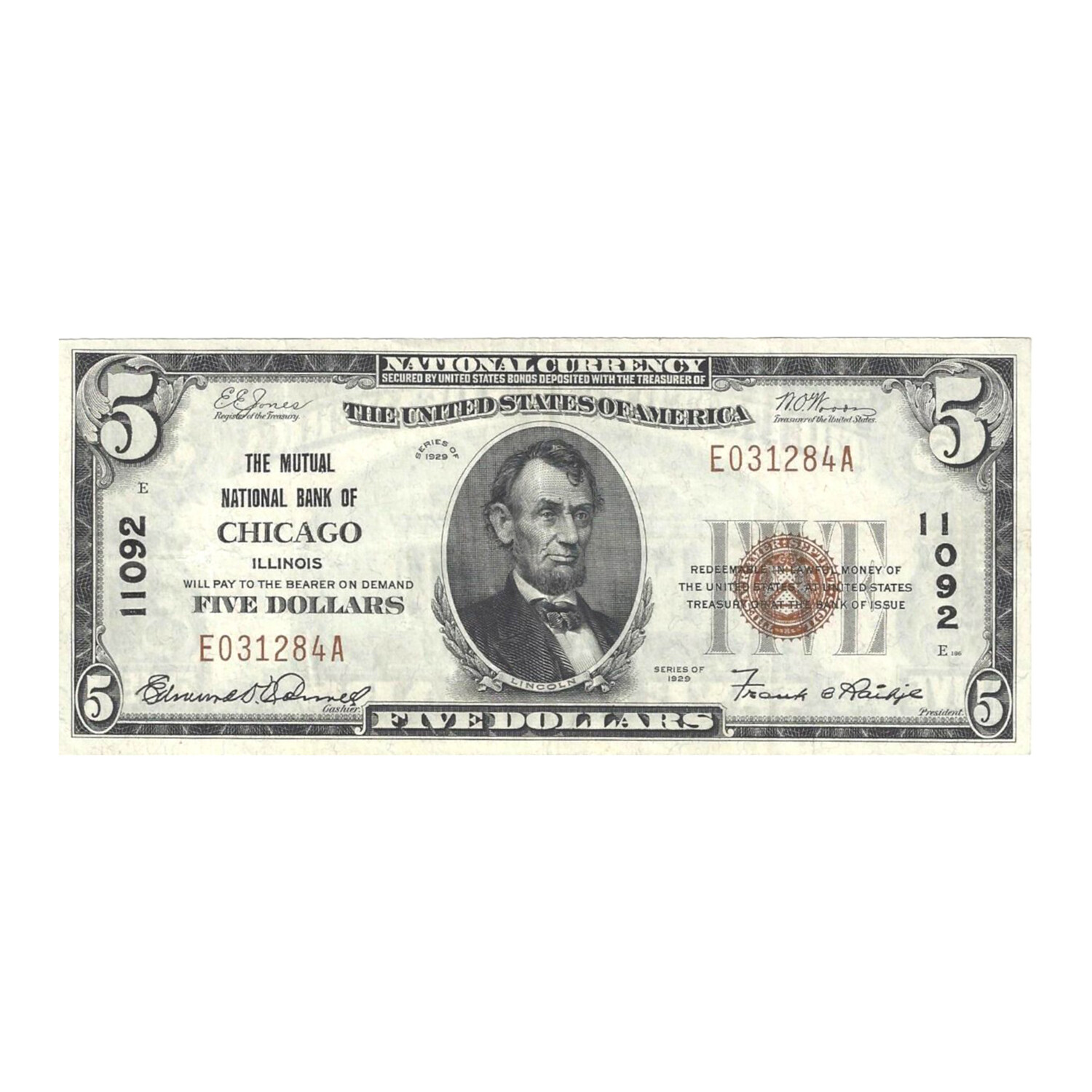 This note is a 1929 $ 5 MUTUAL NATIONAL BANK OF CHICAGO, IL. Their charter number was 1092. It is the Type 1 series. Serial # E 031284A