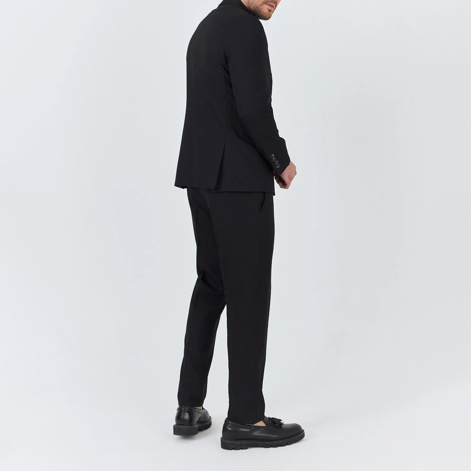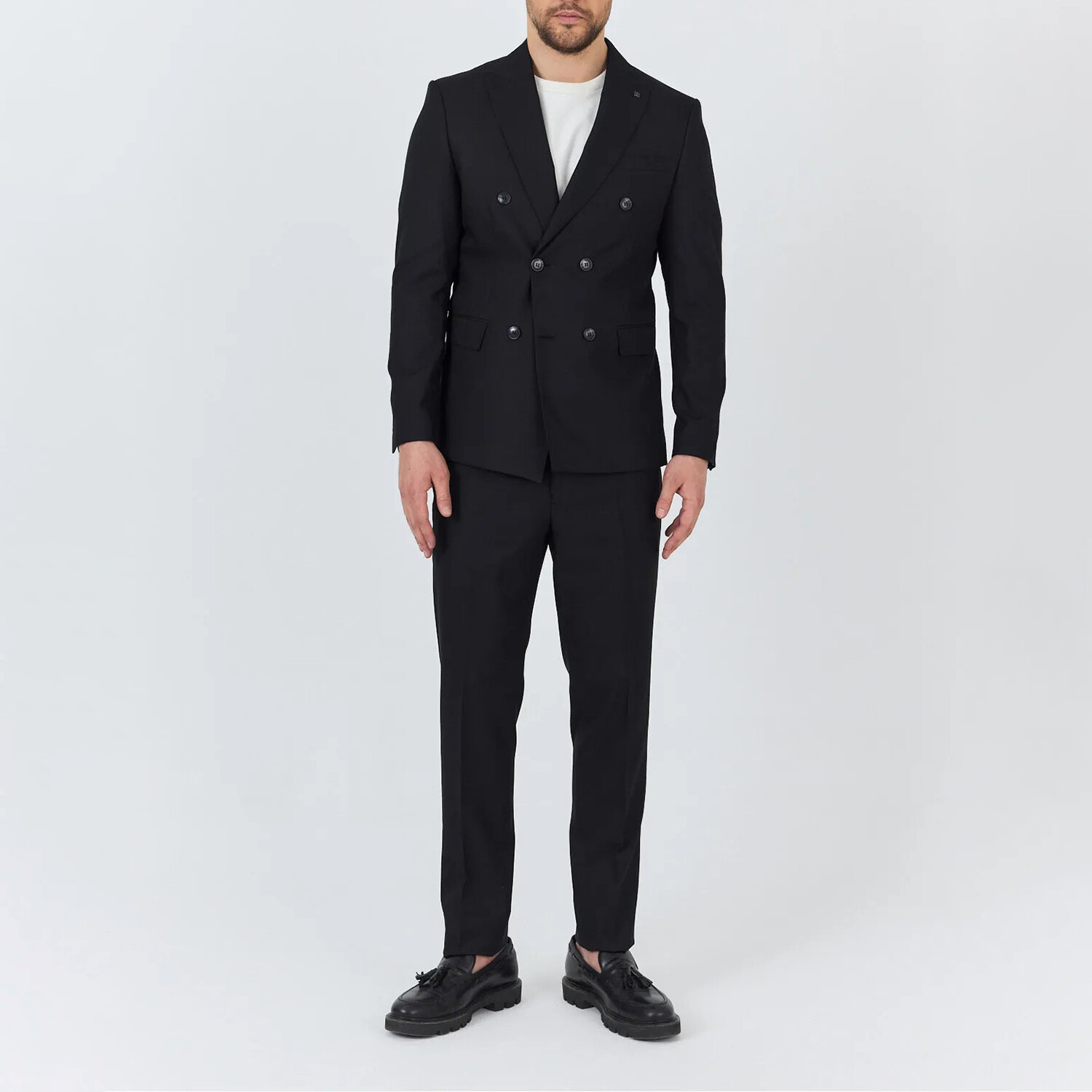 Double Breasted Pointed Collar Plain Slimfit 2 Piece Men Suit Pants: length 110 cm, not rolled up, buttoned and cuffed. Jacket: Double slit, left chest pocket, pointed collar, six buttons.