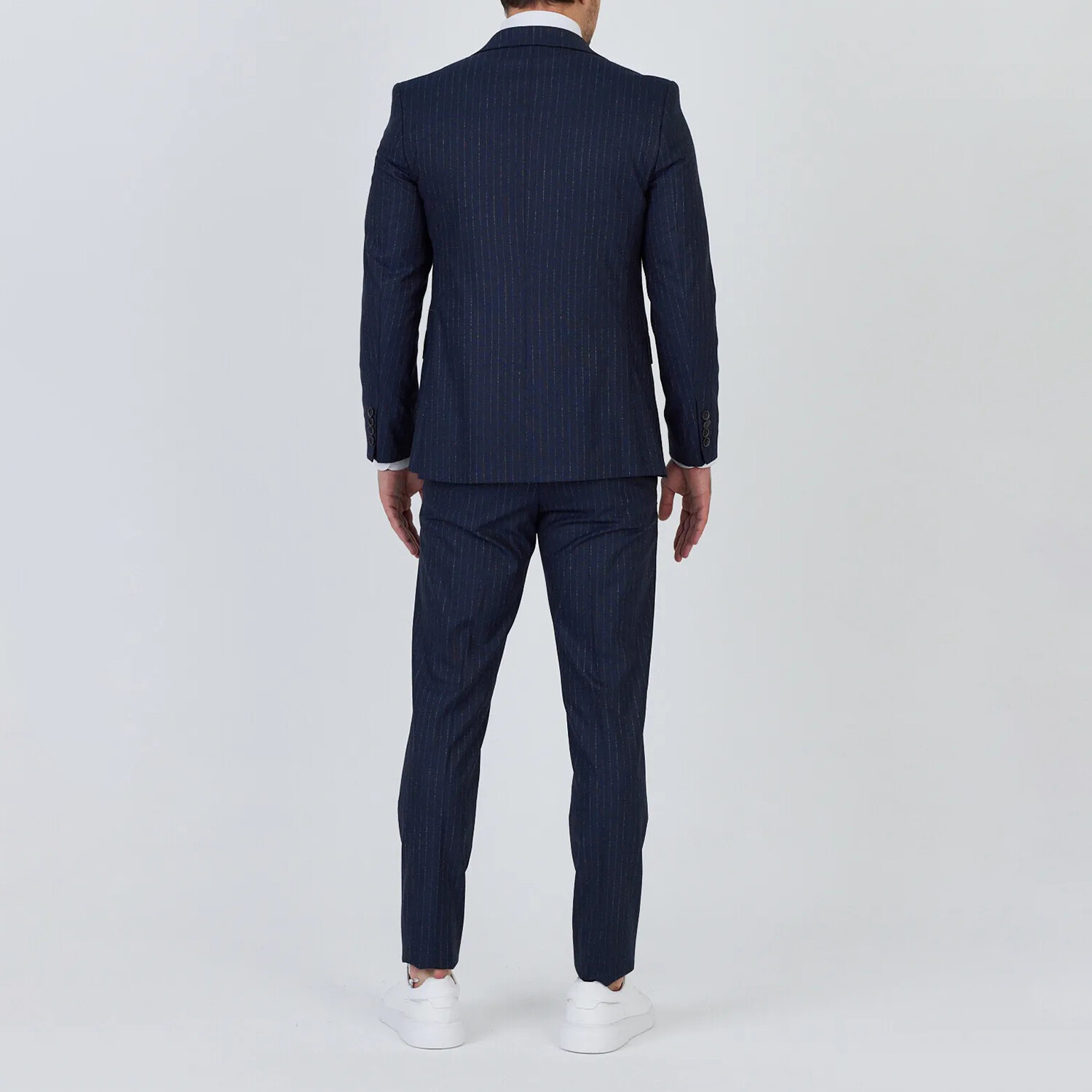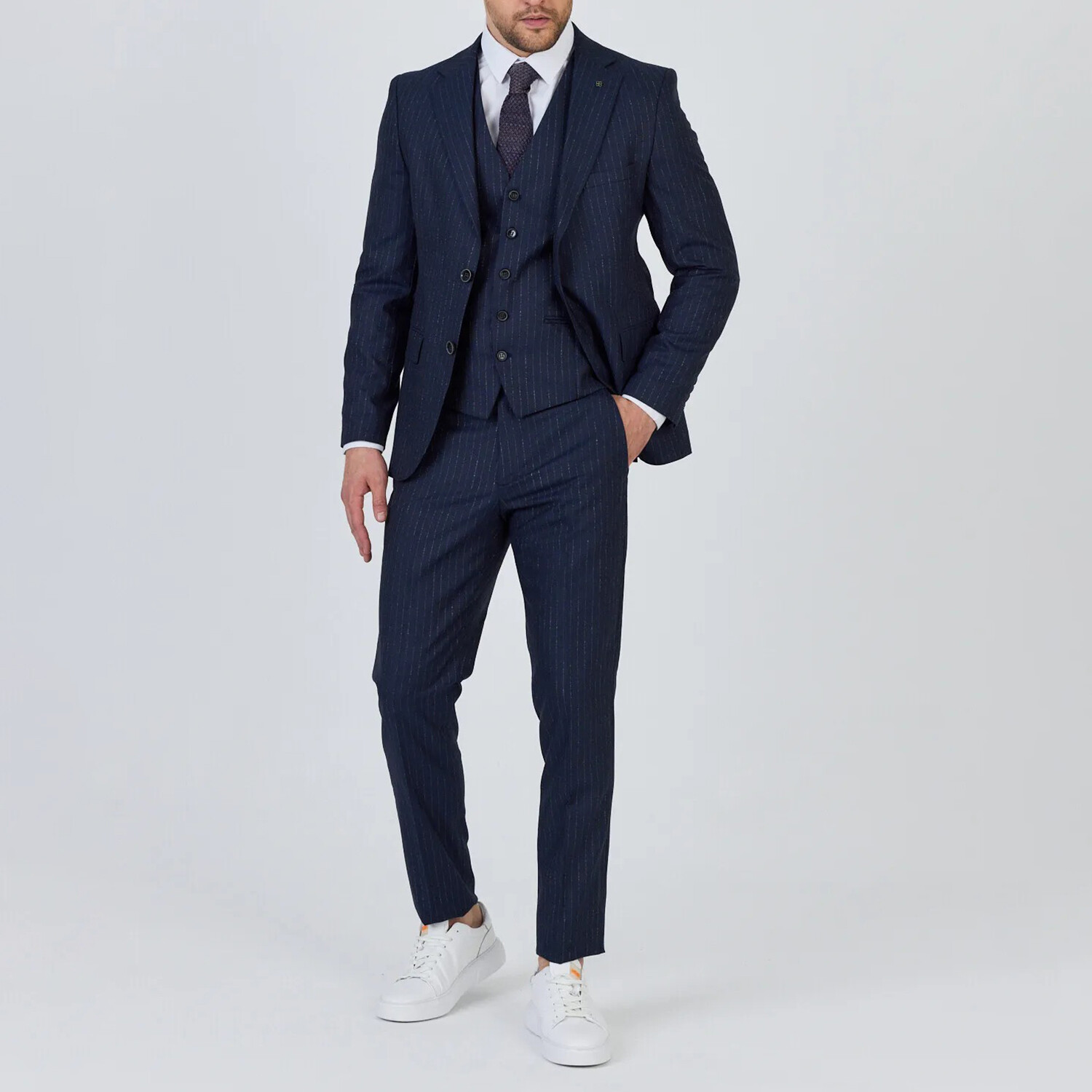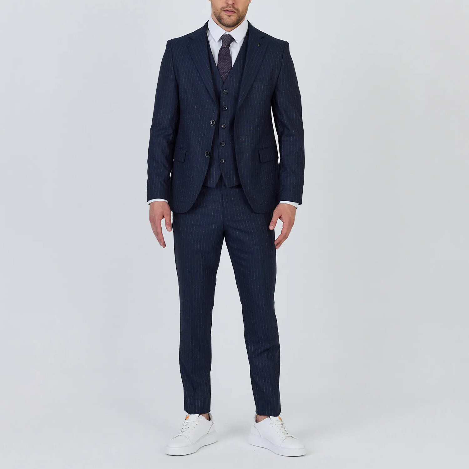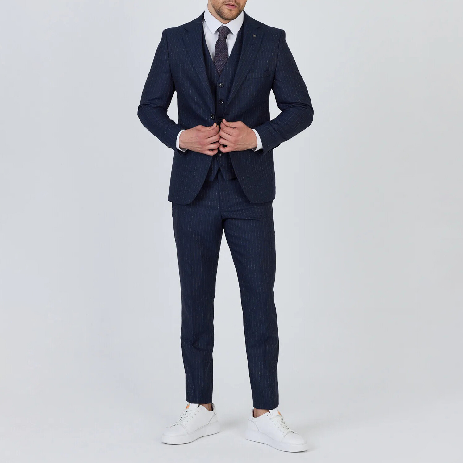 3-Piece Striped Slim Fit Notch Collar Two Button Suit // Navy Blue