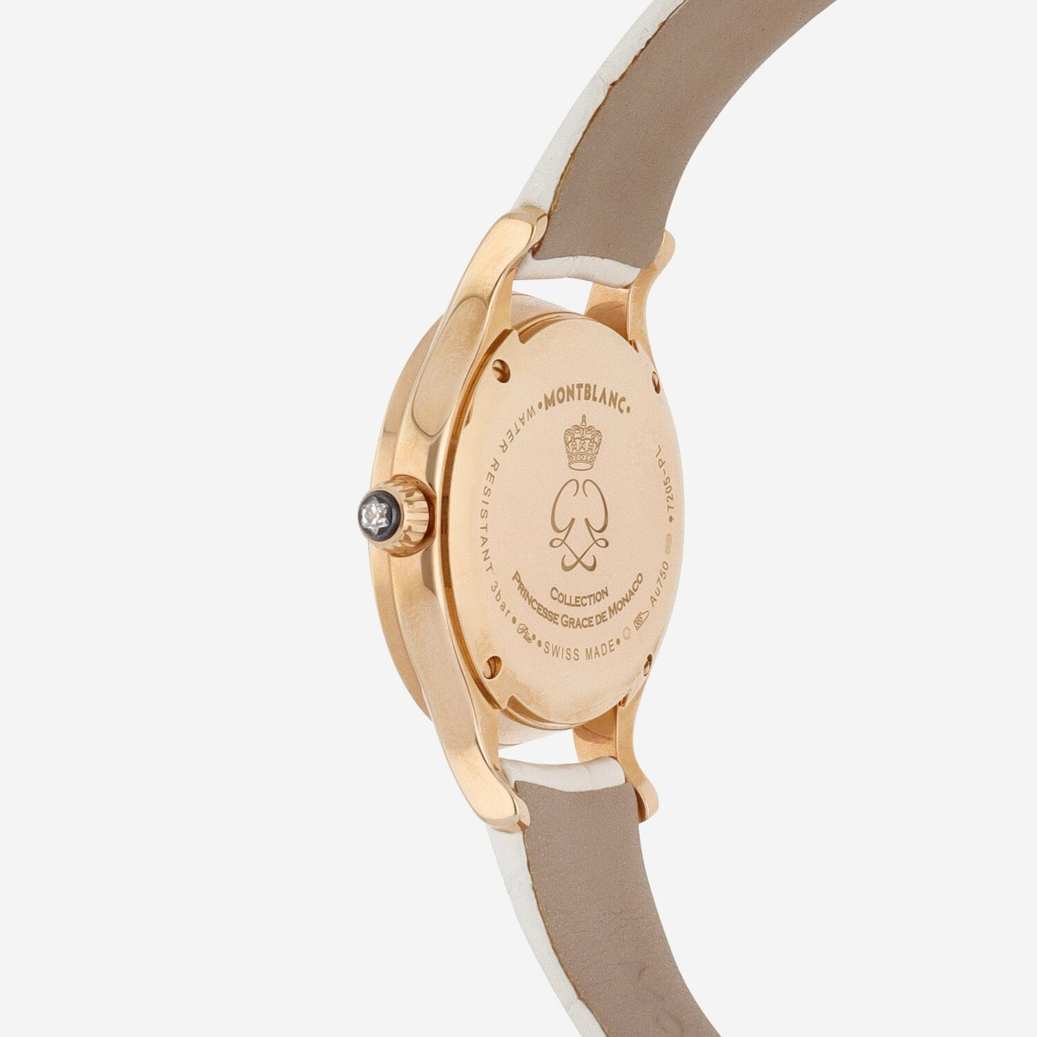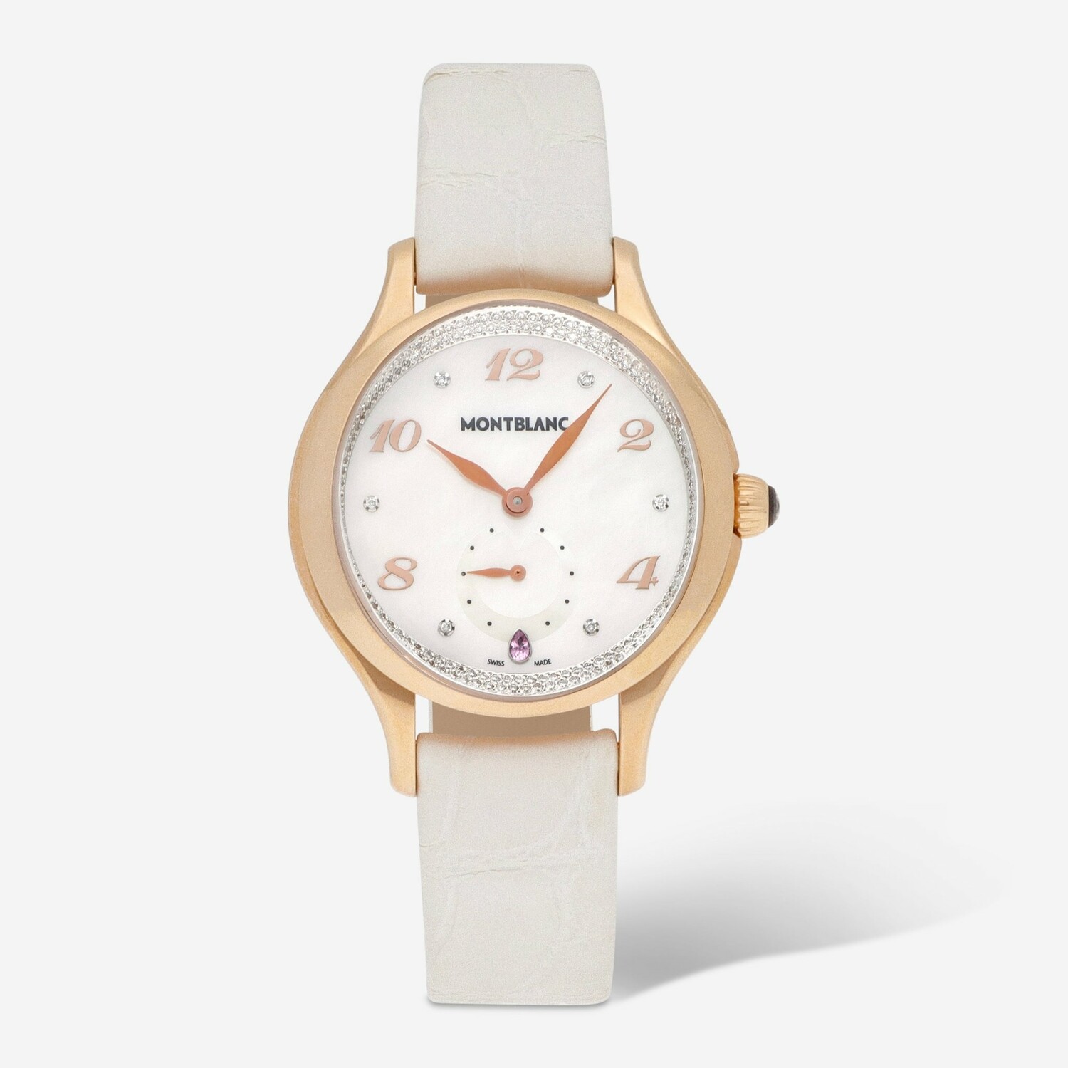 Indulge in timeless elegance with this exquisite 18K rose gold quartz watch, inspired by Princess Grace de Monaco. The 34mm case, crafted from luxurious 18K rose gold, is adorned with a radiant mother-of-pearl dial, elegantly set with diamonds to enhance its sophisticated charm. This piece seamlessly blends opulence with precision, featuring a quartz movement housed within a sleek, rose gold bezel. Secured by a white leather strap and a tang buckle, this watch is a statement of refined luxury. Made in Switzerland, it embodies both grace and functionality, offering water resistance up to 30 meters. Ideal for the modern woman who appreciates a touch of royal elegance, this timepiece is as functional as it is beautiful, making it a perfect accessory for any occasion. Comes with an original Montblanc box, booklet, and a 2 year Solist warranty.