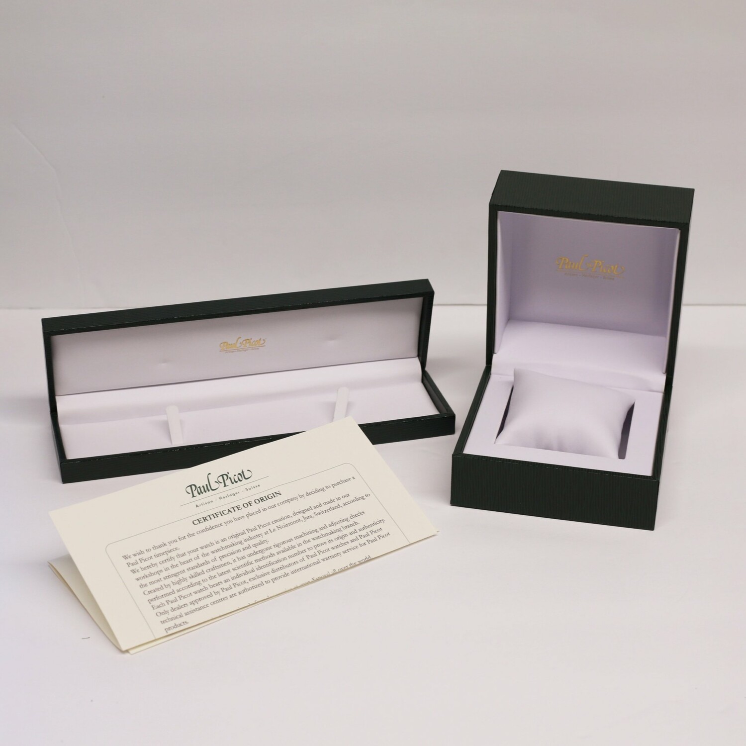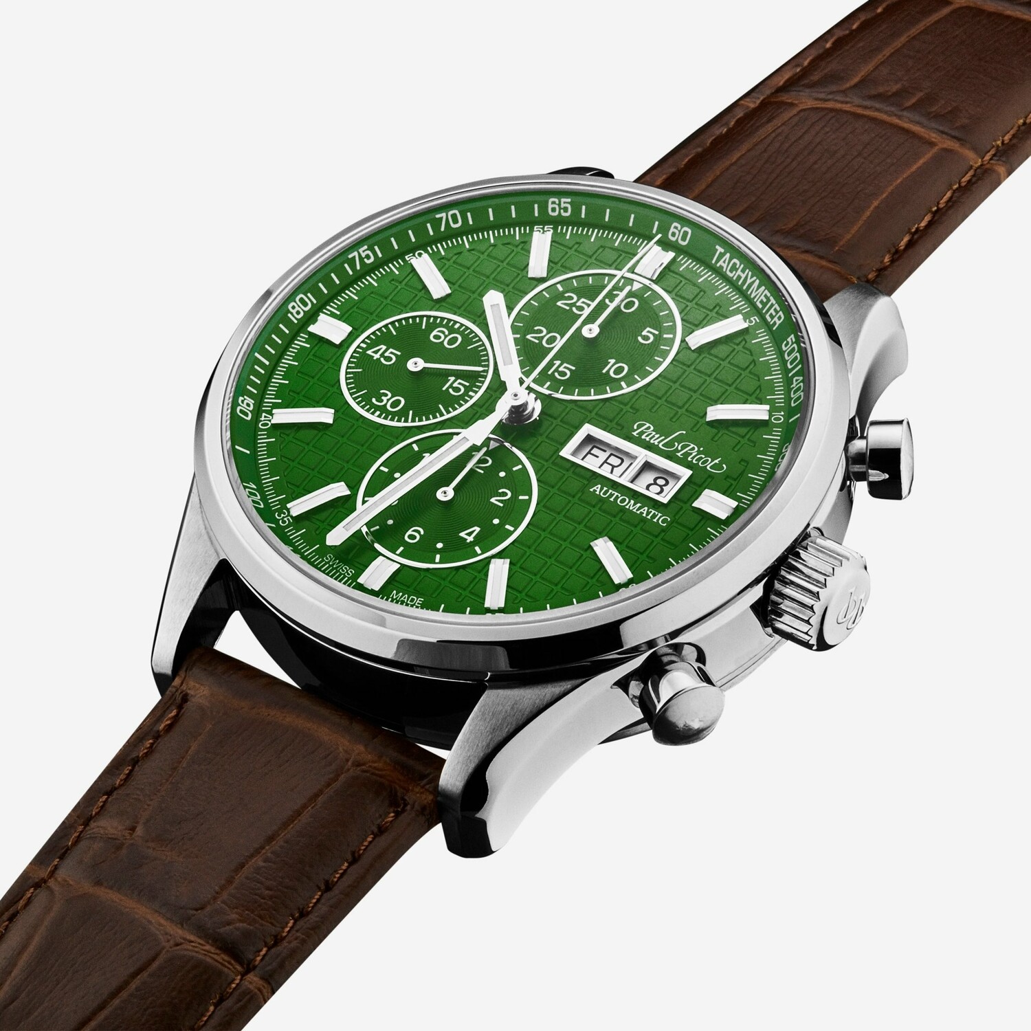 The Paul Picot Gentleman Blazer Chronograph Men's Automatic Watch showcases a stainless steel round case with a screw-down exhibition sapphire caseback. Its fixed silvertone stainless steel bezel complements the green analog dial, adorned with luminescent white indices and hands. Featuring a day-date display at 3 o'clock and three subdials indicating small seconds at 9 o'clock, central seconds, and 30-minute and 12-hour counters at 12 and 6 o'clock respectively, this watch offers comprehensive functionality including hours, minutes, seconds, day-date, and chronograph. The timepiece is equipped with a brown leather strap secured by a tang stainless steel clasp. With an antireflective sapphire crystal protecting the dial and a stainless steel screw-in crown, it ensures water resistance up to 50 meters. Driven by the PP4160 movement, based on La Joux-Perret L100 Roue à Colonne, this watch boasts a remarkable power reserve of 60 hours. Measuring 42 mm in diameter and 15 mm thick, with a strap width of 21 mm and length of 8 inches, this Swiss-made timepiece epitomizes elegance and functionality. It comes with box, papers, and a 2-year Solist warranty.