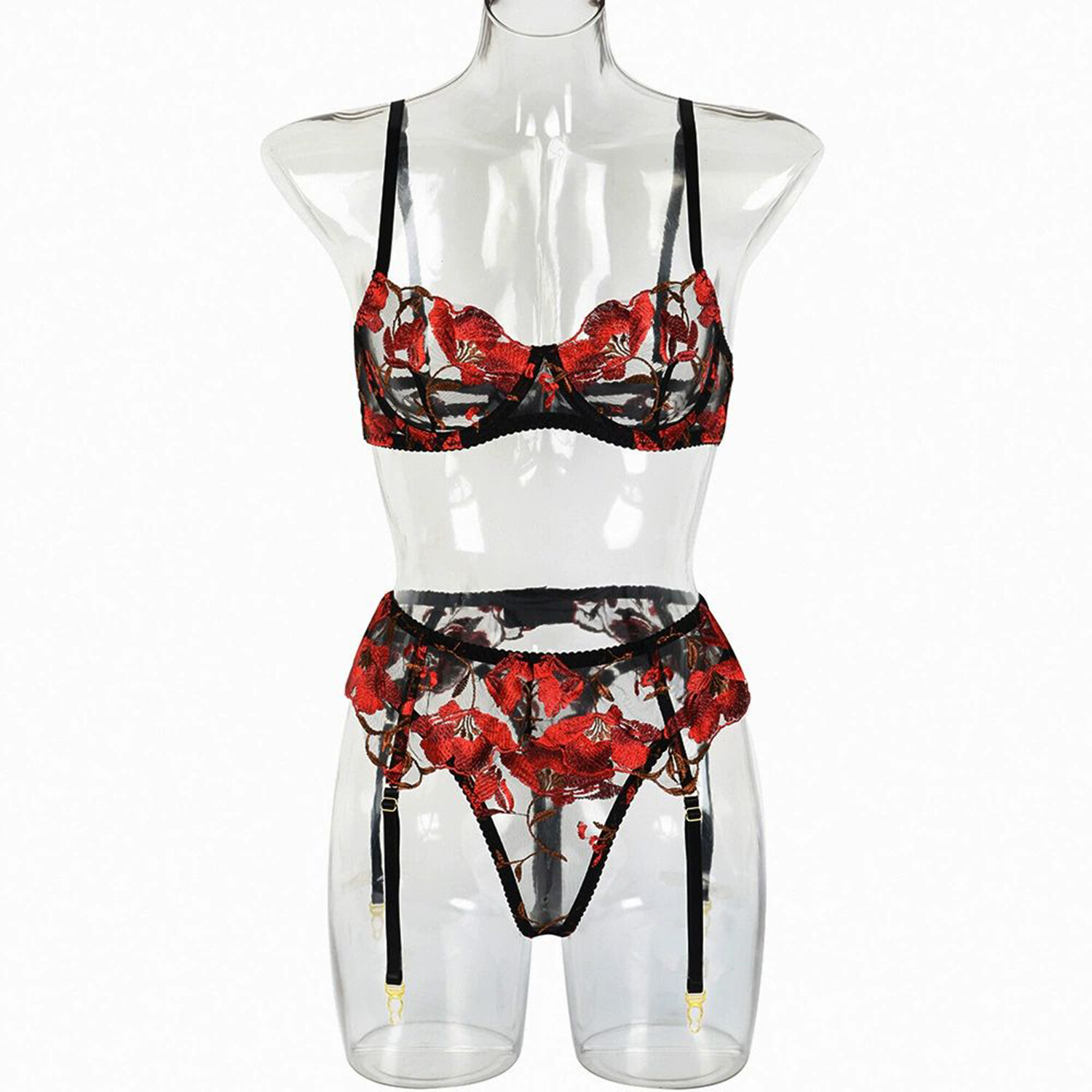 Turn up the heat with this mesmerizing three-piece design that blends vibrant red floral embroidery with sheer black mesh. The underwired bra provides support while beautifully highlighting your curves, and the scalloped lace details add a touch of feminine elegance. The matching garter belt enhances your waistline, giving a sultry hourglass effect, while the thong completes the seductive ensemble.