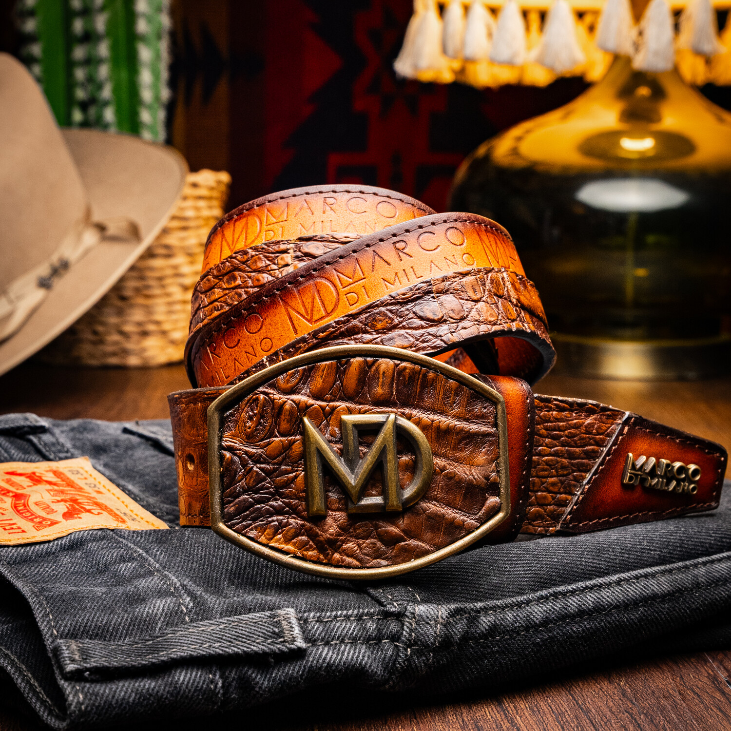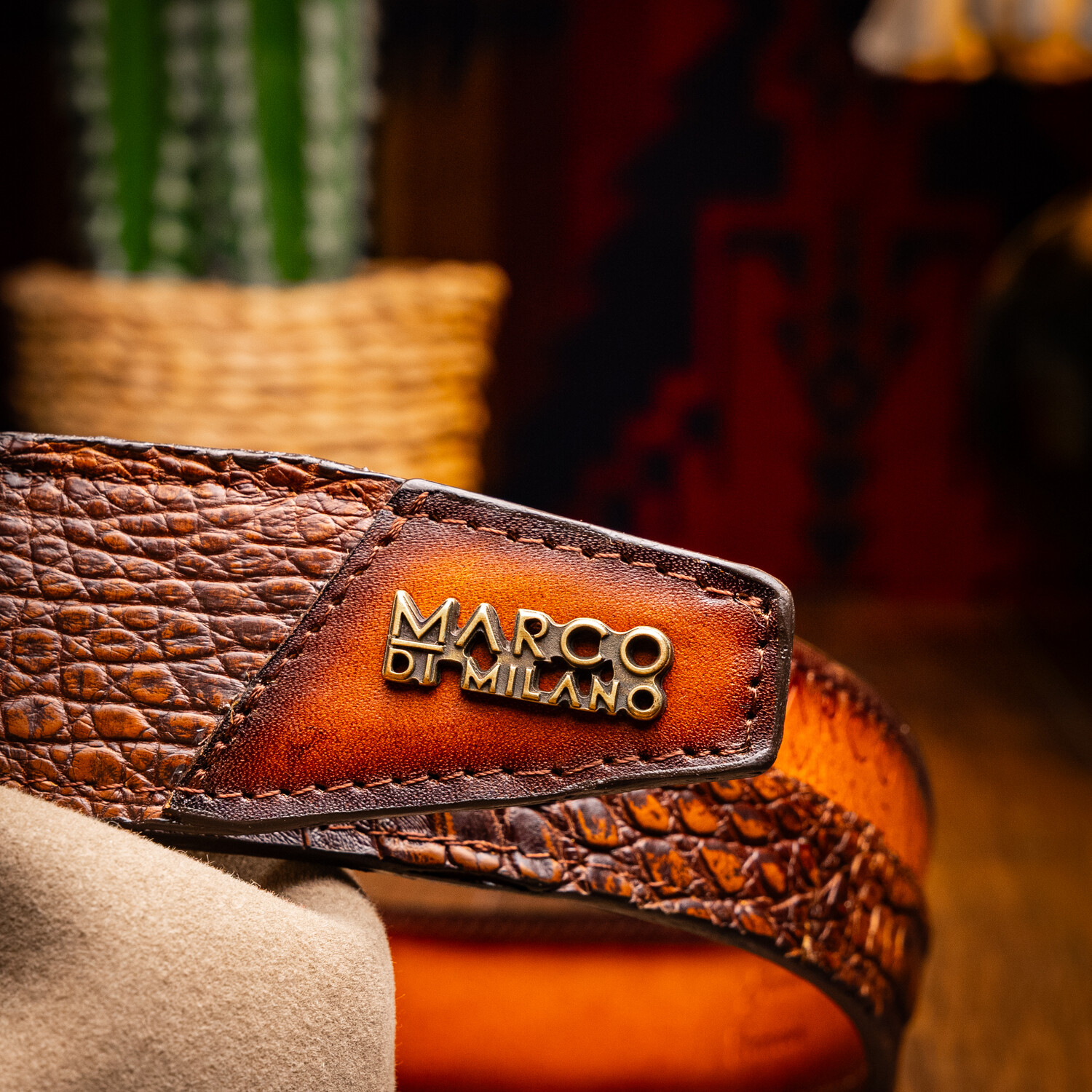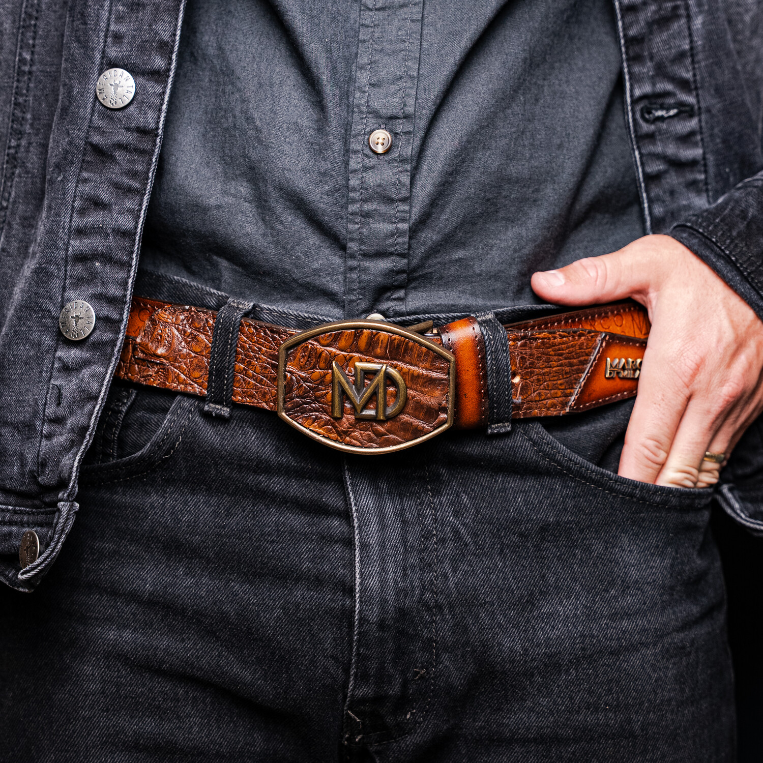 The TEXAS belt is a bold fusion of exotic luxury and branded identity. Handcrafted from genuine caiman crocodile skin and contrasted with premium full-grain calf leather, it delivers a striking interplay of textures. The calf leather front is hot-stamped with the Marco Di Milano insignia, adding depth, dimension, and unmistakable identity to the exterior design.