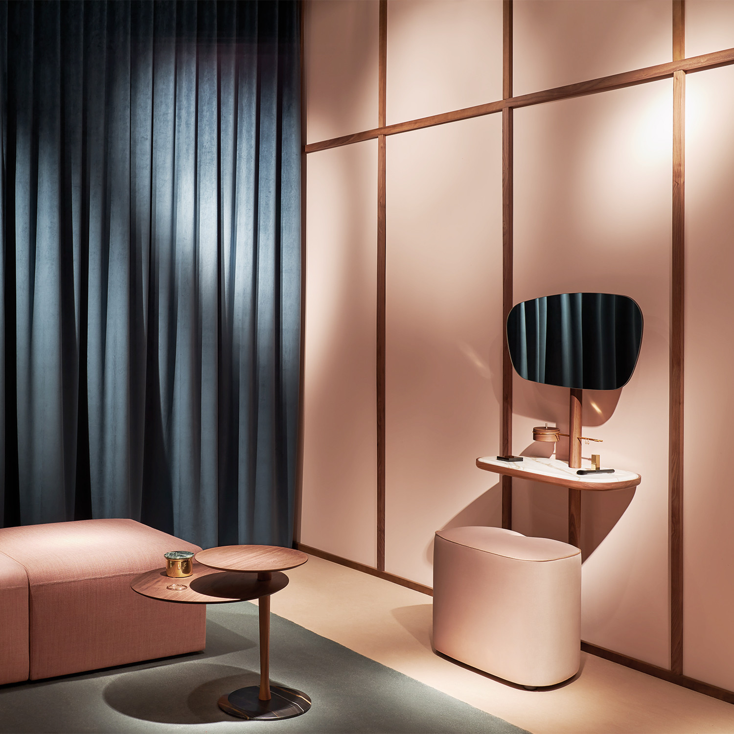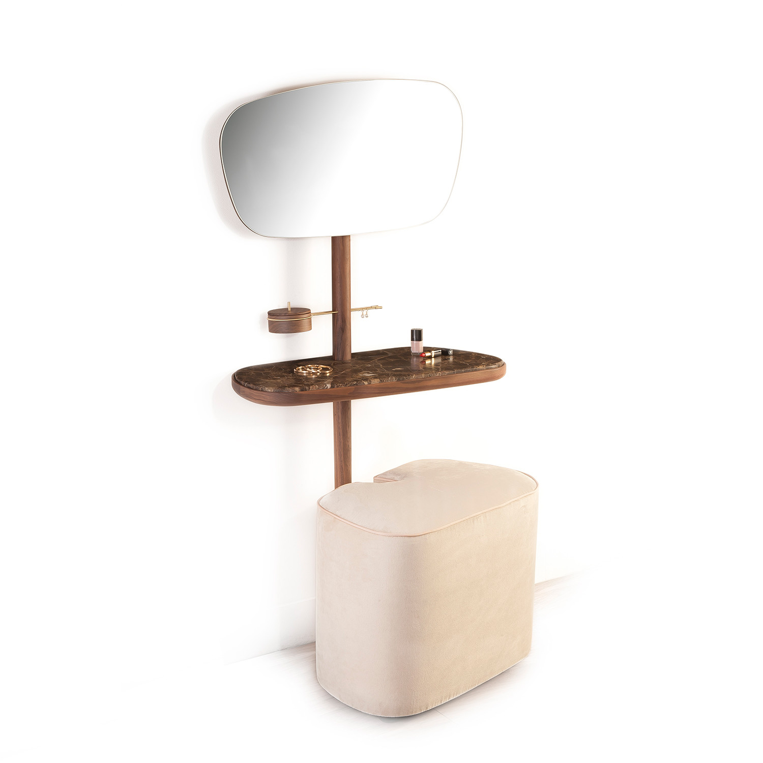 This Tocador Table highlights sensitivity and modernity without sacrificing functionality. Softness is centered in the shapes and materials, so your time sat on its velvet upholstered pouf is intimate and delicate. The Emperor marble table top adds a masculine, classic edge.