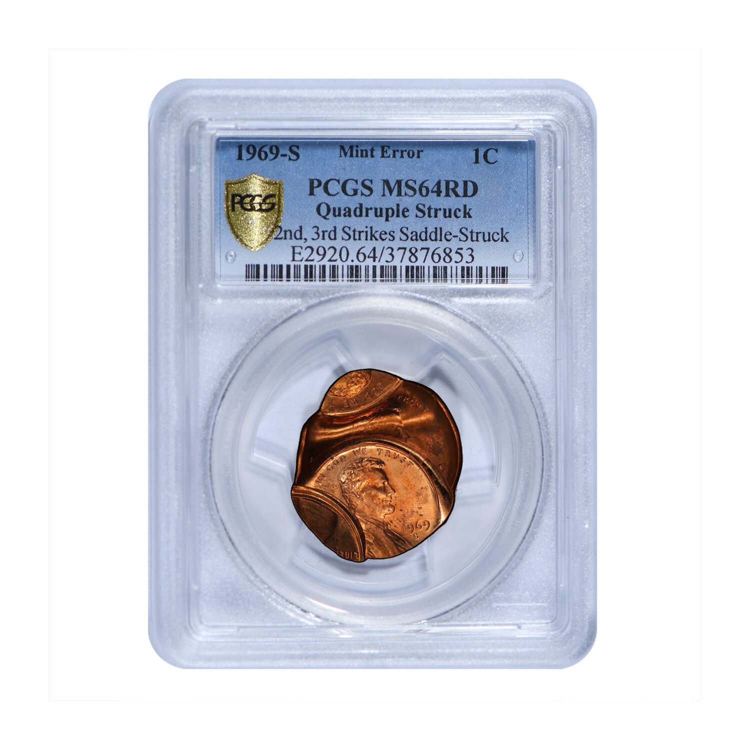 1969-S Lincoln Memorial Cent // Dramatic Quadruple Strike Mint Error // PCGS Certified MS64RD // Wood Display Box
