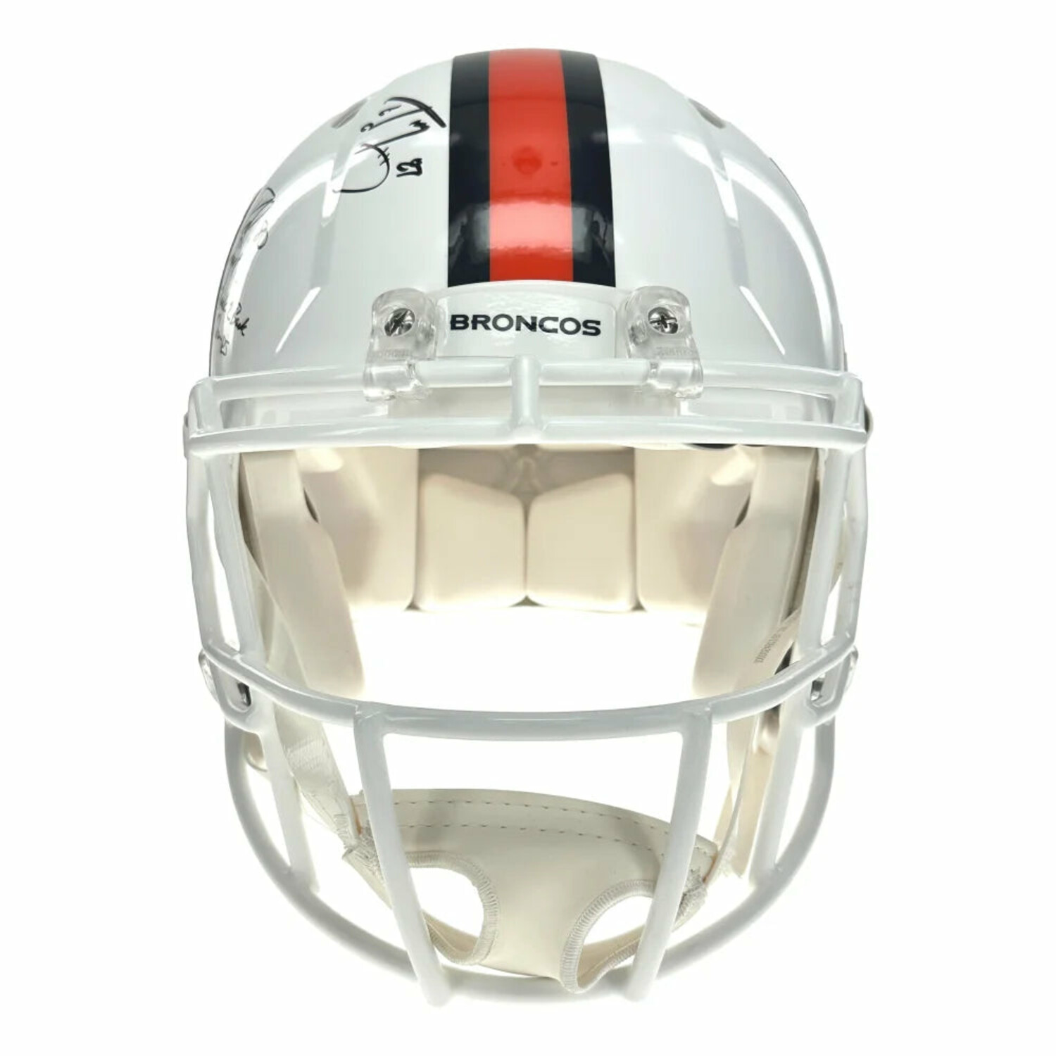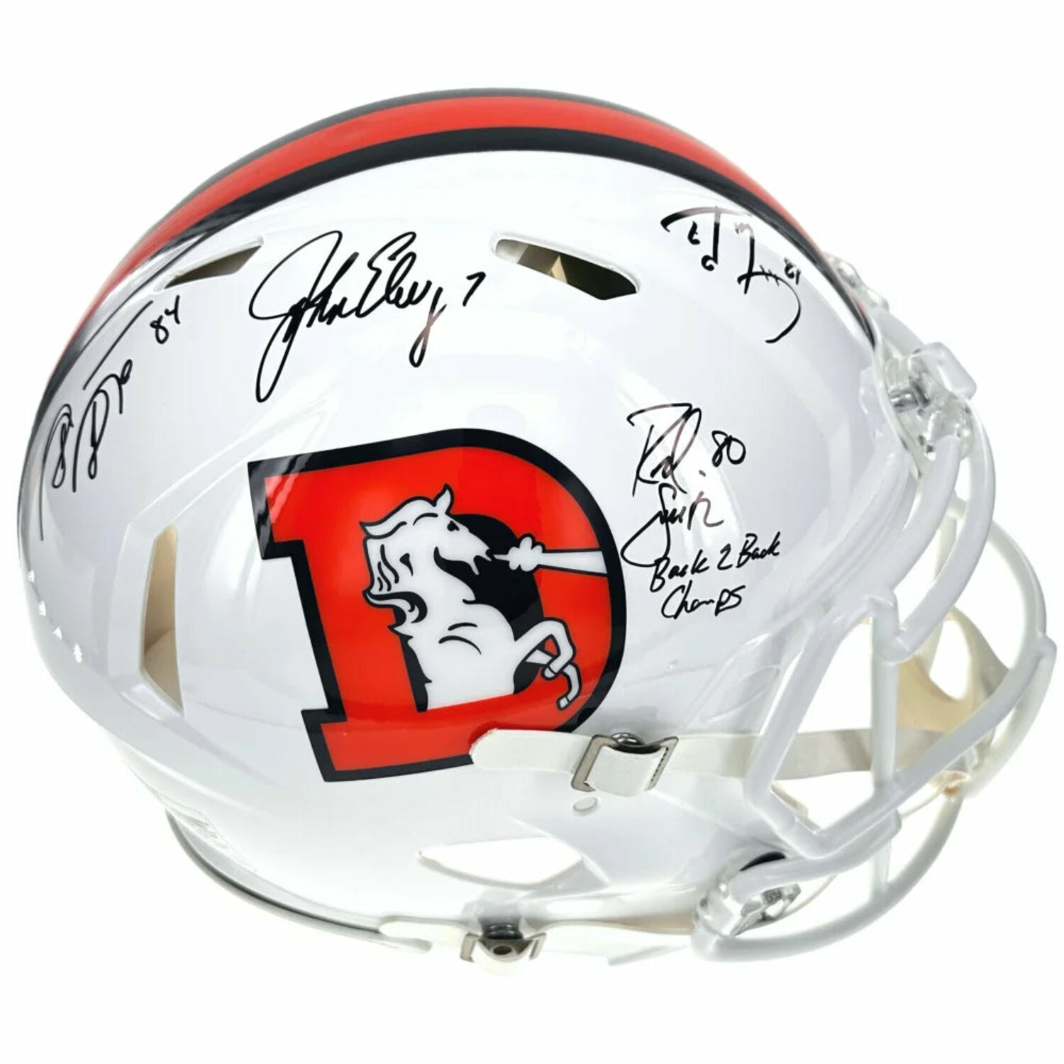 Denver fans, this item is your calling! Check out this Full Size Authentic On-Field Alternate Speed Denver Broncos Helmet made by Riddell that features the authentic autographs of Super Bowl 32 & 33 Champions: John Elway, Shannon Sharpe, Ed McCaffrey & Rod Smith! This brand-new helmet has never been displayed and is hand signed by all four players in black marker—ready to shine in your man cave, office, game room, or lady lair. This is an incredible helmet signed by the top offensive players on the team—an item very rarely seen!