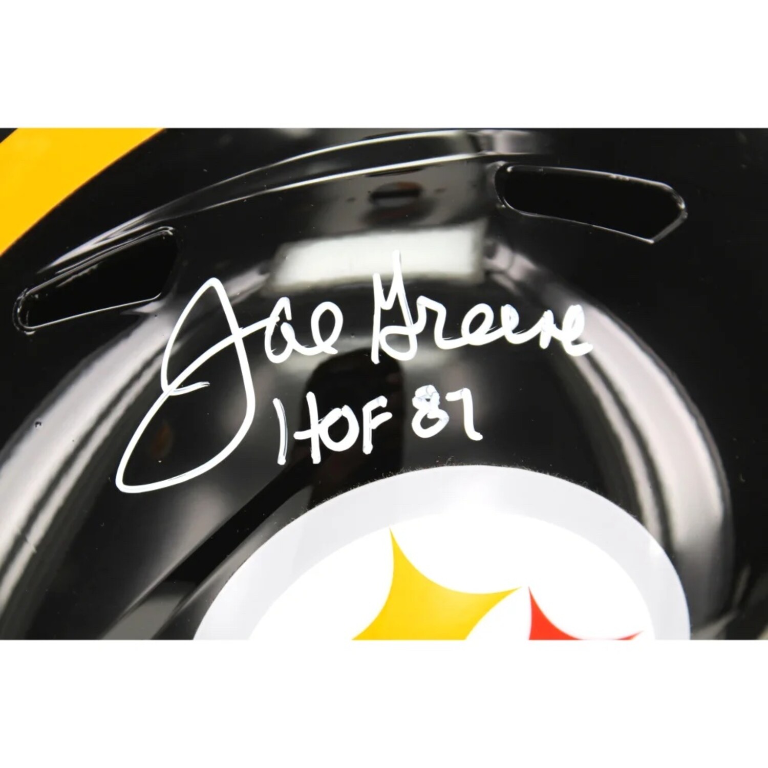 This replica helmet is hand-signed by Joe Greene in bold white paint pen and features his personal "HOF 87" inscription, honoring his 1987 induction into the Pro Football Hall of Fame. It's a striking collectible that belongs in any serious Steelers fan’s display.