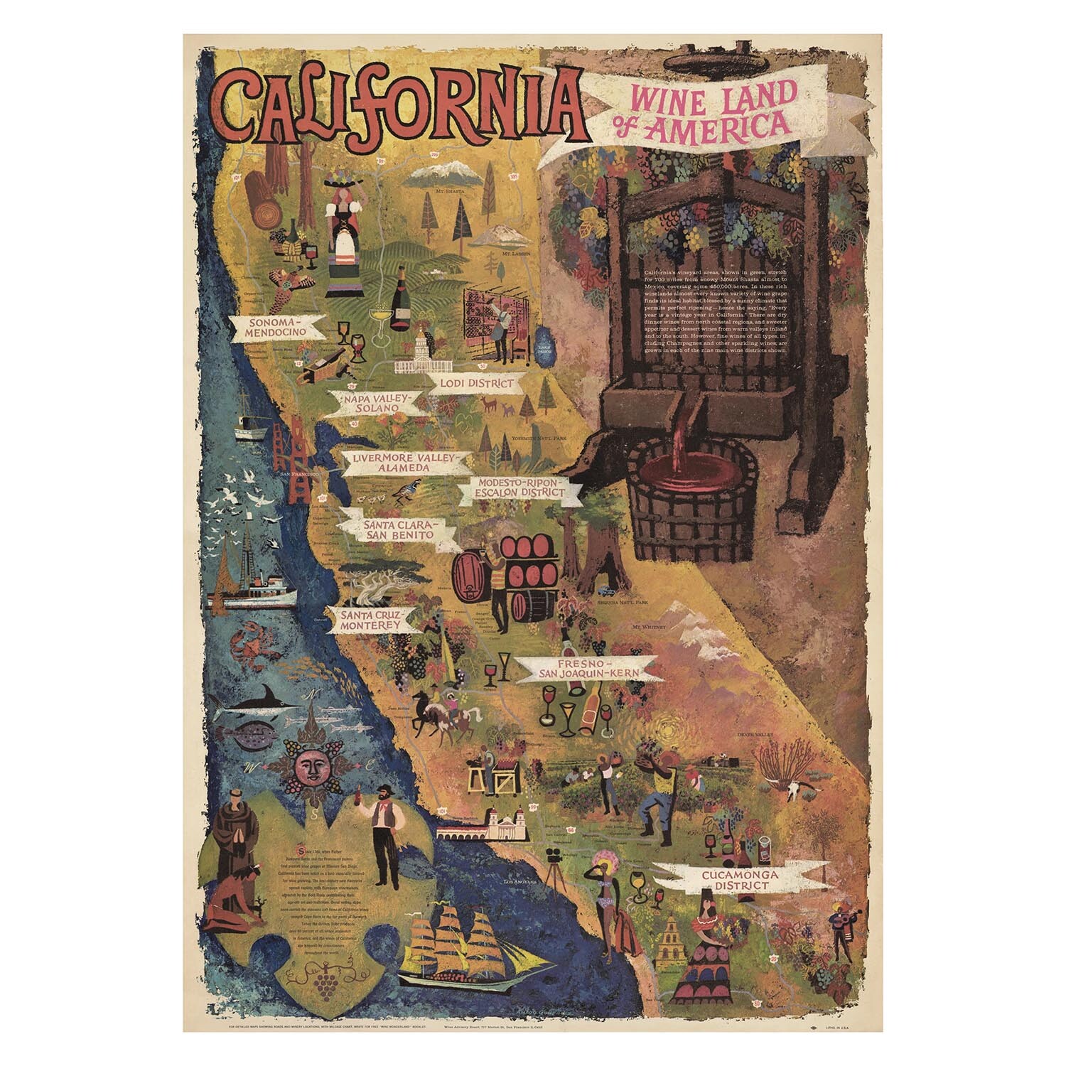This is a fine print reproduction of a vibrant vintage poster that presents much of California with a focus on the wine regions. It was originally published by the ‘Wine Advisory Board’, to advertise the state’s ever-increasing contribution to the wine-producing industry of the USA. The imagery of the poster conveys the multi-faceted aspects of the industry in the state, along with the many layers of culture which have contributed to its becoming a major wine-producing center.